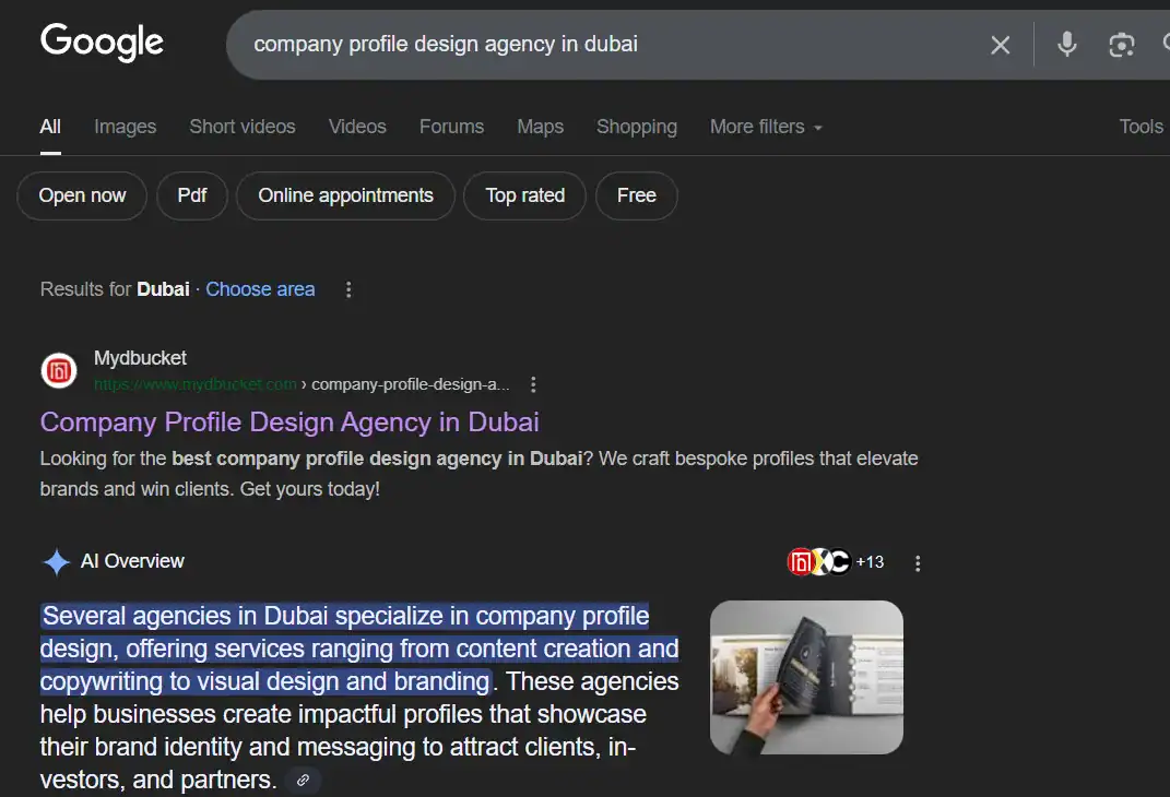We successfully ranked Mydbucket at the #1 position in the UAE for the keyword "Company profile design agency in Dubai."